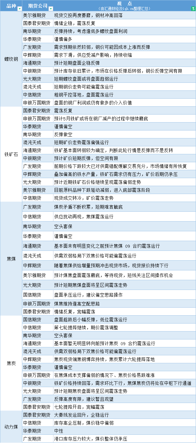 期货公司观点汇总一张图:5月10日黑色系(螺纹钢、焦煤、焦炭、铁矿石、动力煤等)