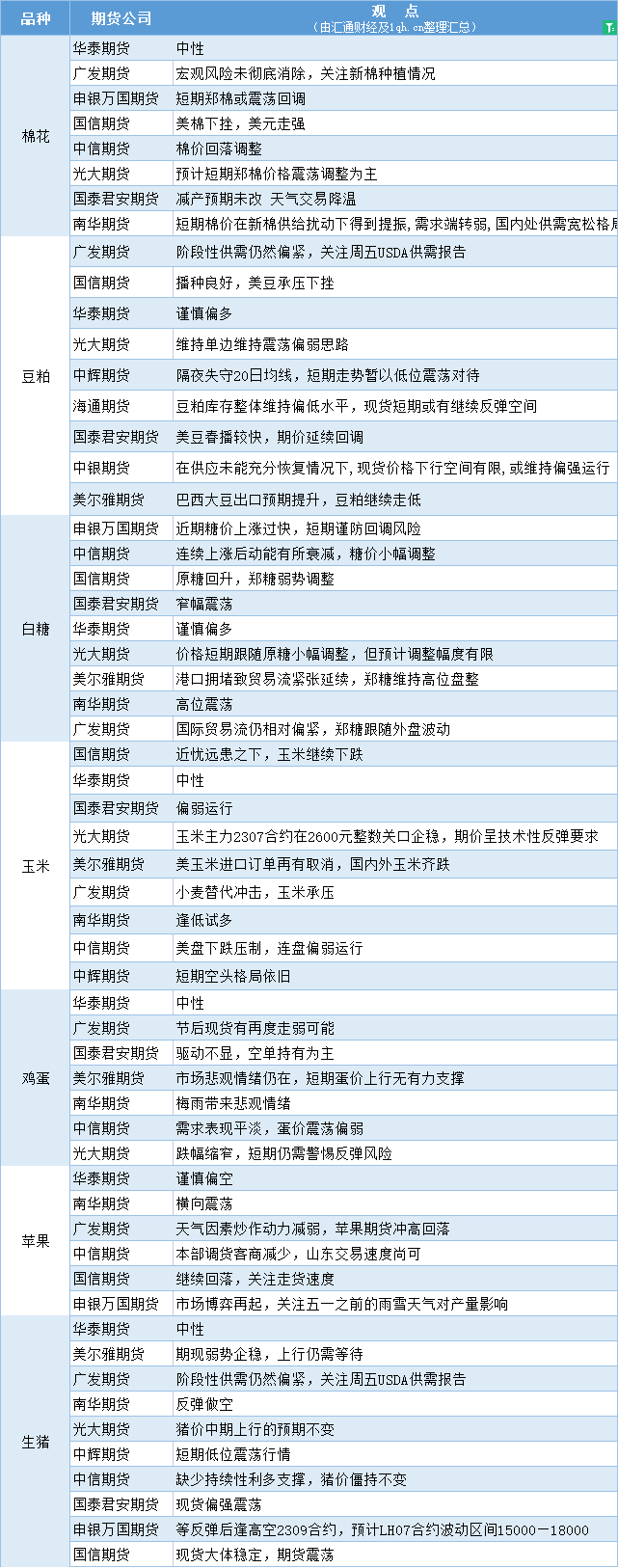 期货公司观点汇总一张图:5月10日农产品(棉花、豆粕、白糖、玉米、鸡蛋、生猪等)