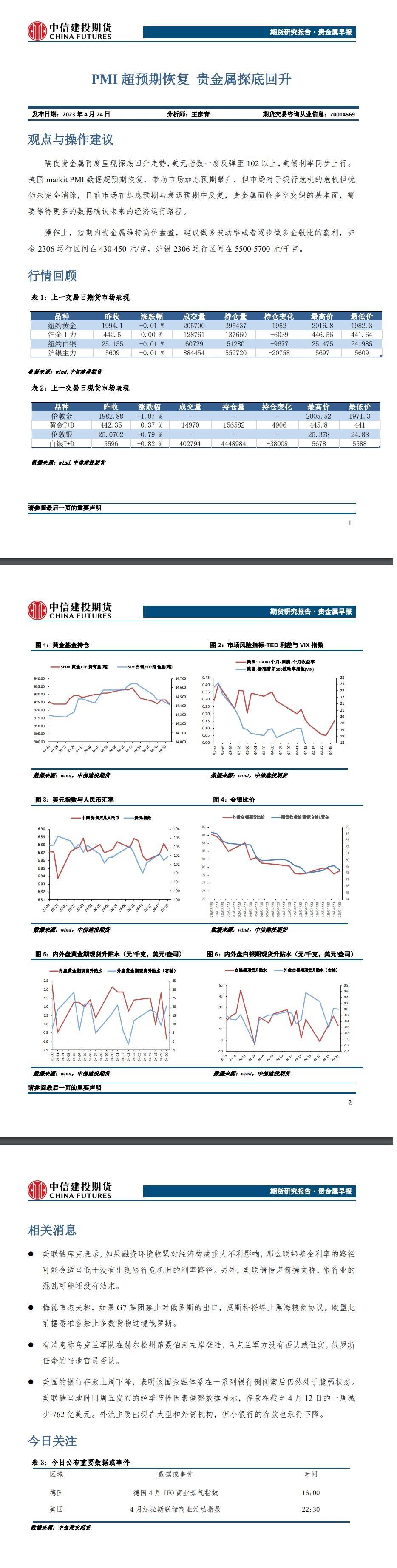 中信建投期货4月24日贵金属早报:PMI超预期恢复,贵金属探底回升