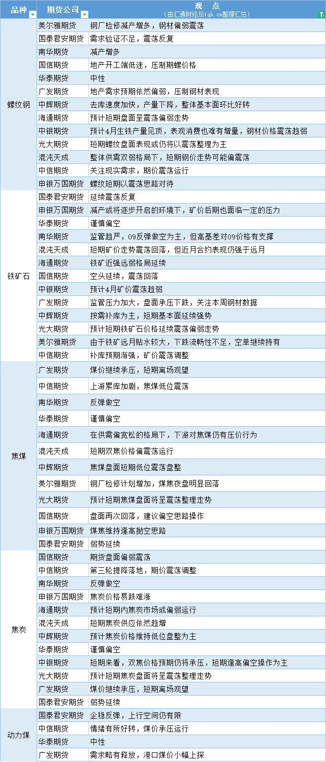 期货公司观点汇总一张图:4月20日黑色系(螺纹钢、焦煤、焦炭、铁矿石、动力煤等)
