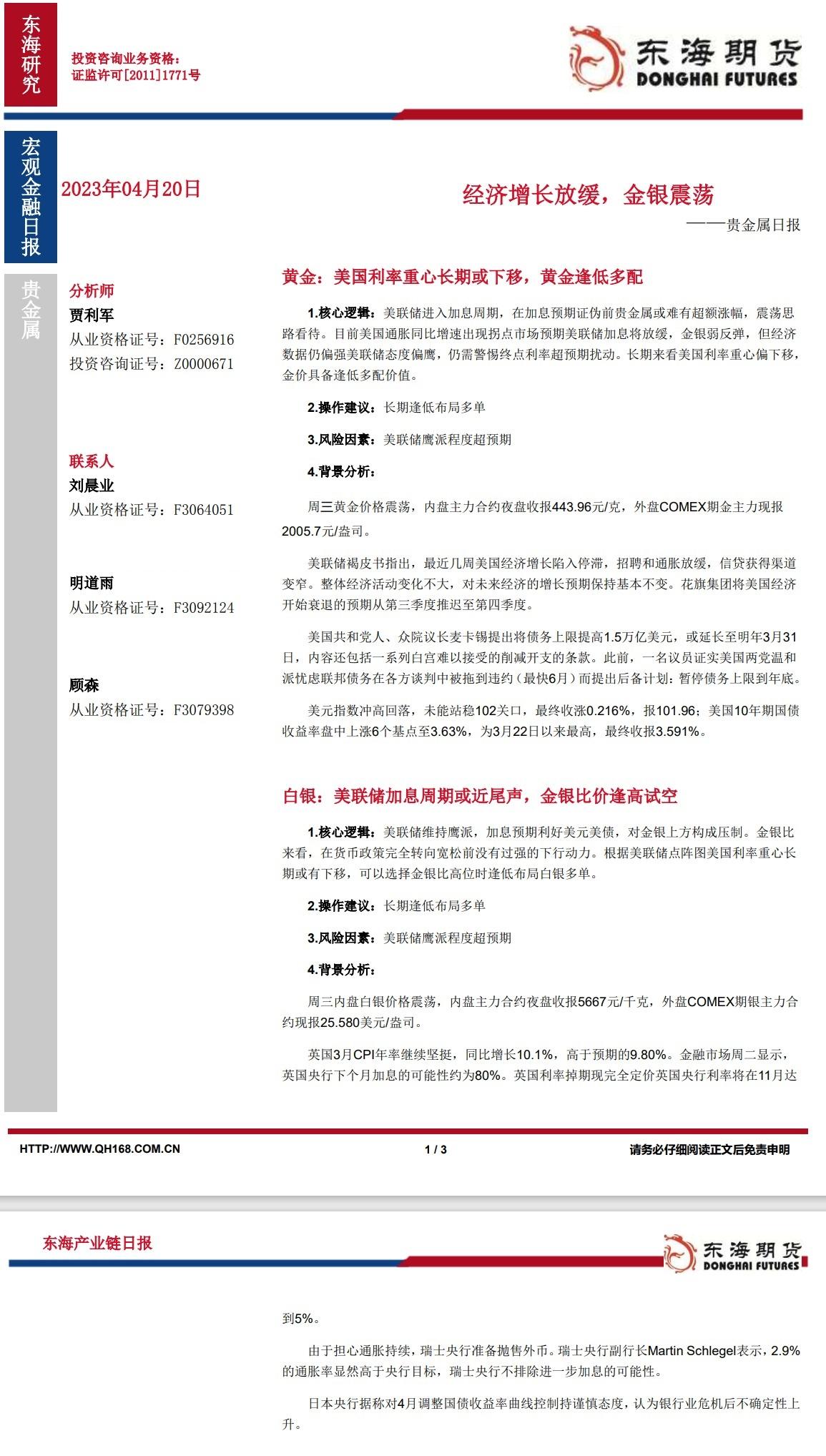 【东海期货4月20日产业链日报】贵金属篇:经济增长放缓,金银震荡