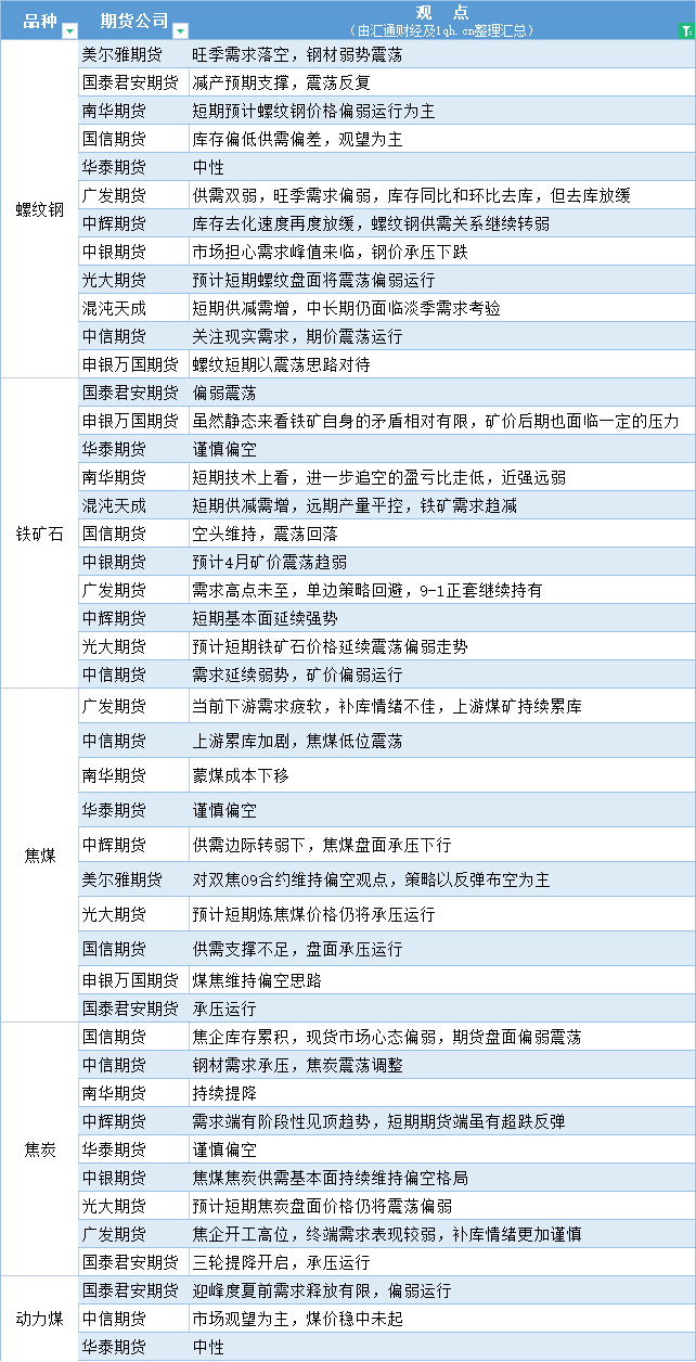 期货公司观点汇总一张图:4月17日黑色系(螺纹钢、焦煤、焦炭、铁矿石、动力煤等)