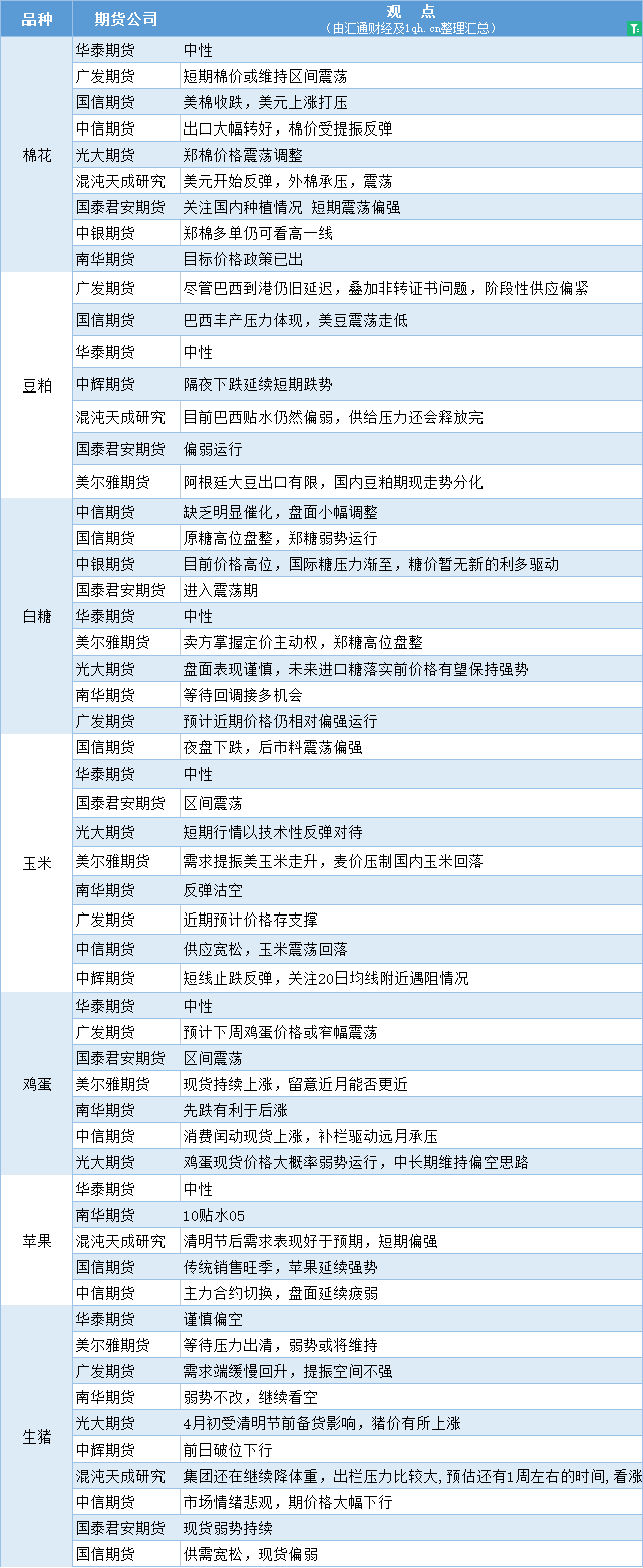 期货公司观点汇总一张图:4月17日农产品(棉花、豆粕、白糖、玉米、鸡蛋、生猪等)