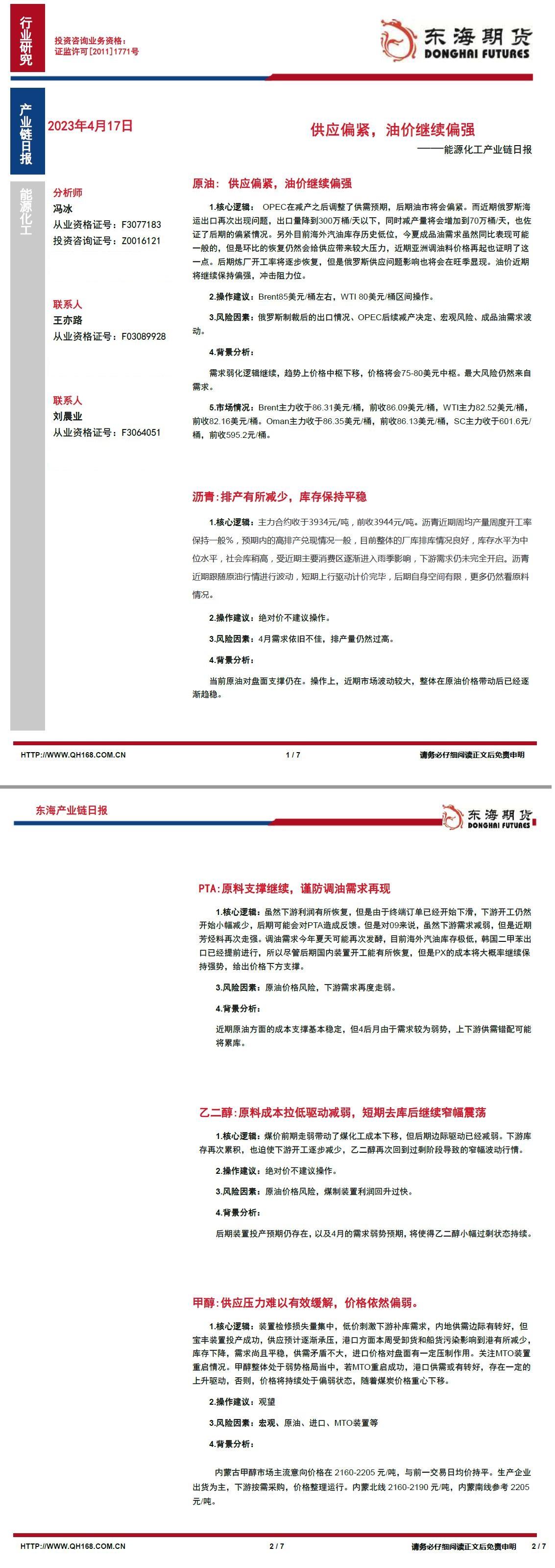 【东海期货4月17日产业链日报】能化篇:供应偏紧,油价继续偏强