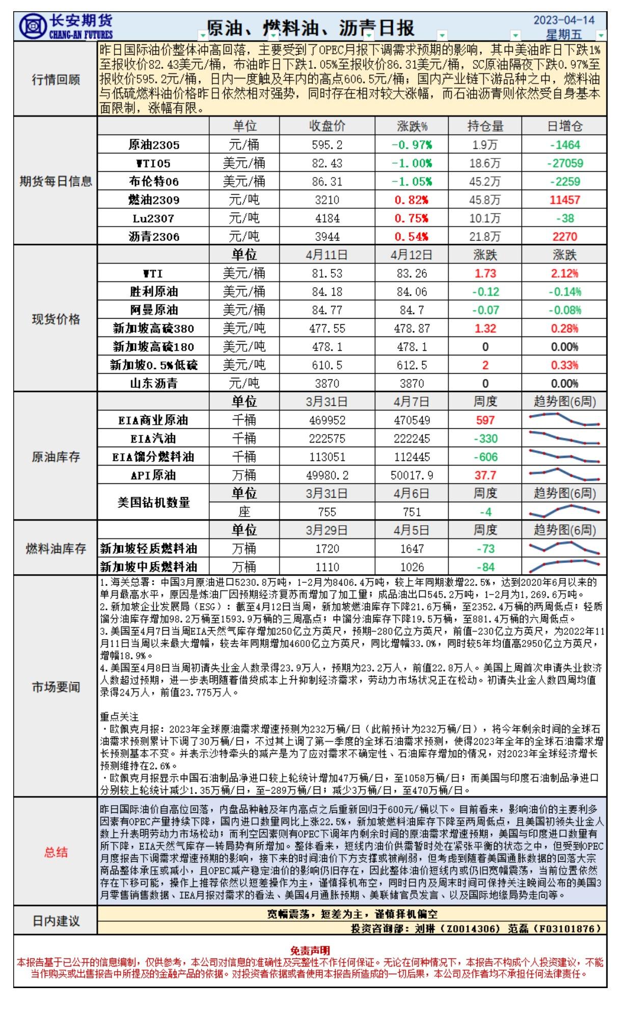长安期货4月14日原油报告:OPEC下调年内需求预期利空油价,日内关注IEA月报及美国3月零售数据