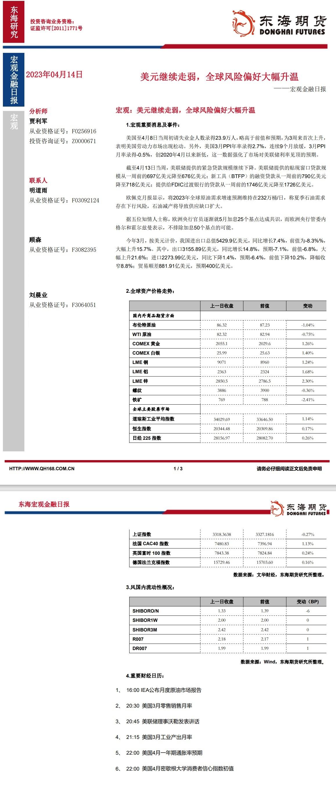 【东海期货4月14日宏观金融日报】:美元继续走弱,全球风险偏好大幅升温