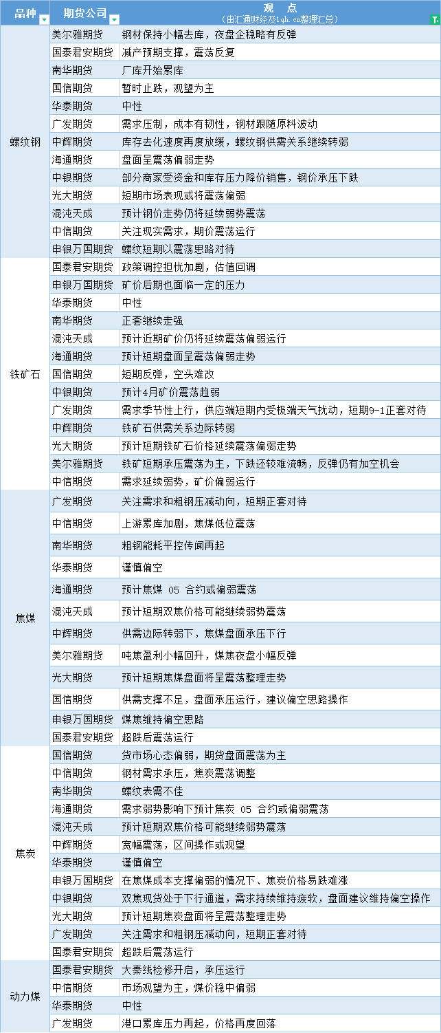 期货公司观点汇总一张图:4月14日黑色系(螺纹钢、焦煤、焦炭、铁矿石、动力煤等)