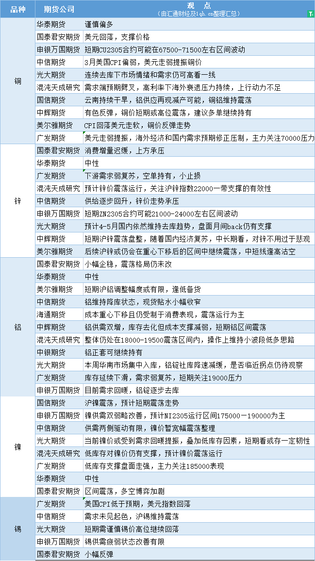 期货公司观点汇总一张图:4月13日有色系(铜、锌、铝、镍、锡等)