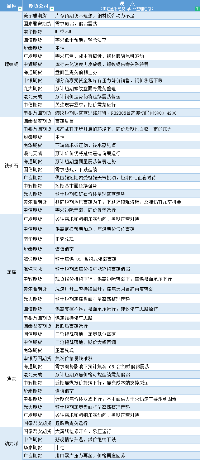 期货公司观点汇总一张图:4月13日黑色系(螺纹钢、焦煤、焦炭、铁矿石、动力煤等)