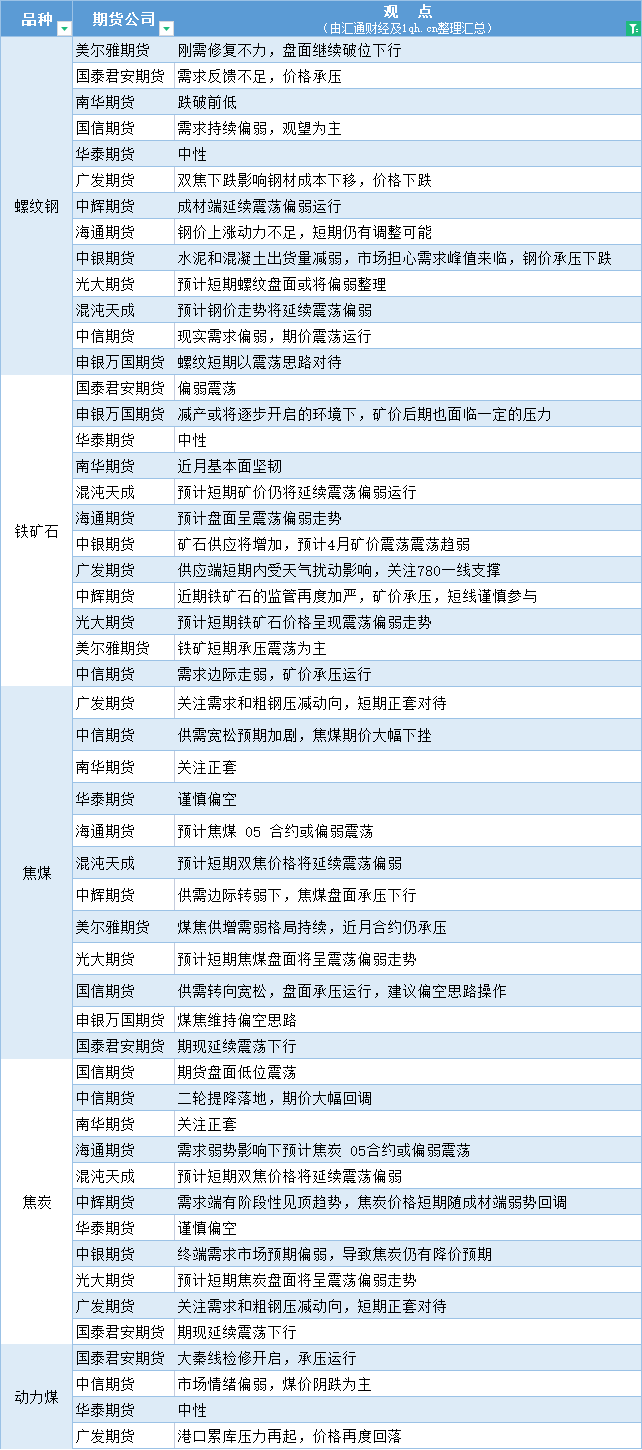期货公司观点汇总一张图:4月11日黑色系(螺纹钢、焦煤、焦炭、铁矿石、动力煤等)