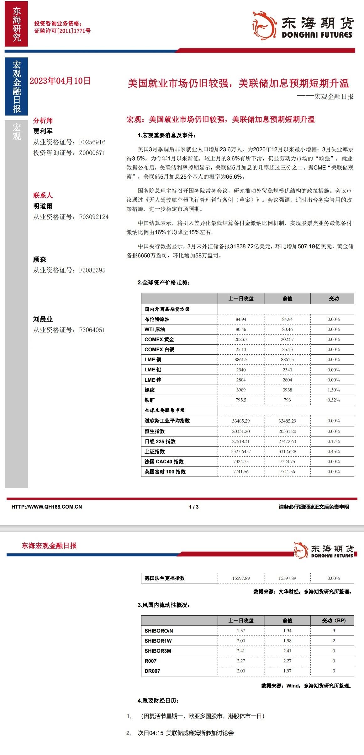 【东海期货4月10日宏观金融日报】:美国就业市场仍旧较强,美联储加息预期短期升温