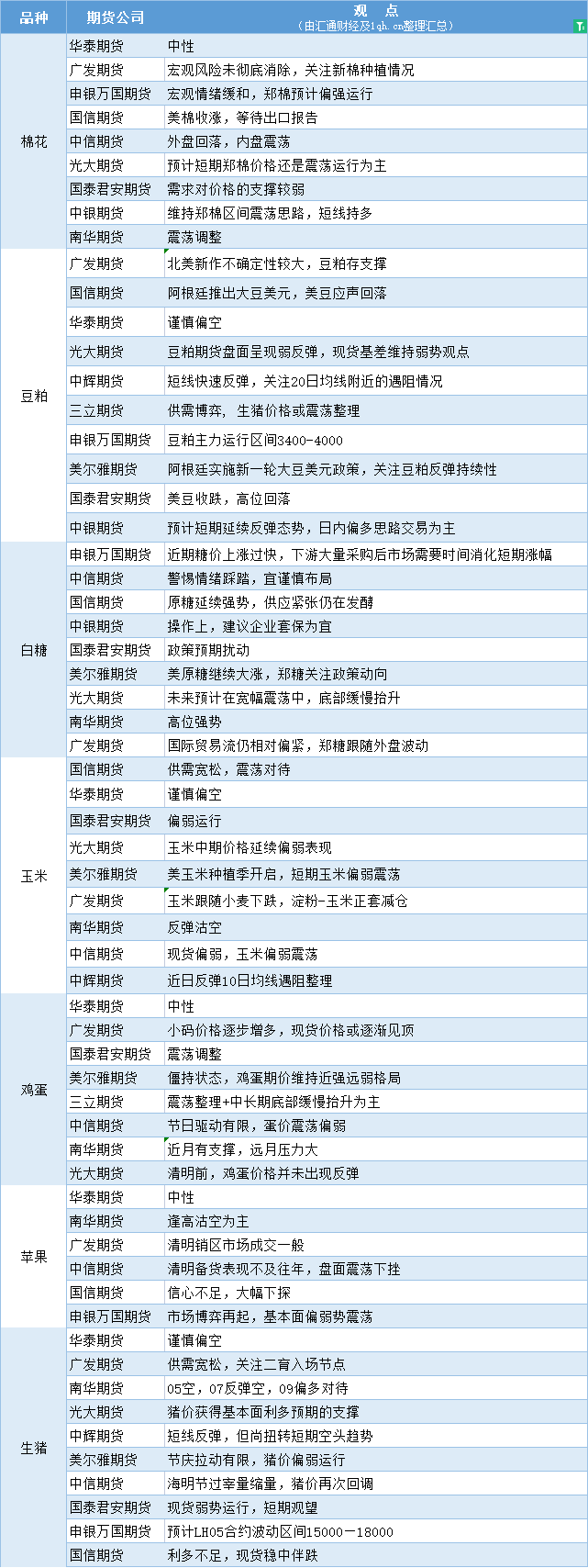 期货公司观点汇总一张图:4月6日农产品(棉花、豆粕、白糖、玉米、鸡蛋、生猪等)