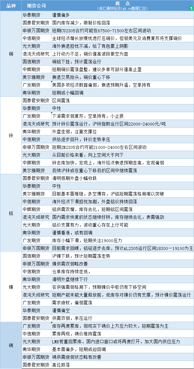 期货公司观点汇总一张图:4月6日有色系(铜、锌、铝、镍、锡等)
