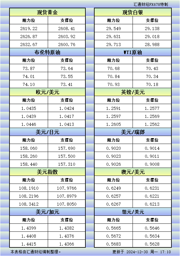 12月30日欧市更新的支撑阻力:金银原油+美元指数等八大货币对