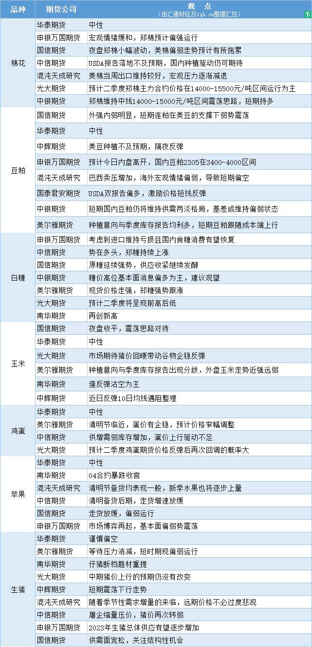 期货公司观点汇总一张图:4月3日农产品(棉花、豆粕、白糖、玉米、鸡蛋、生猪等)