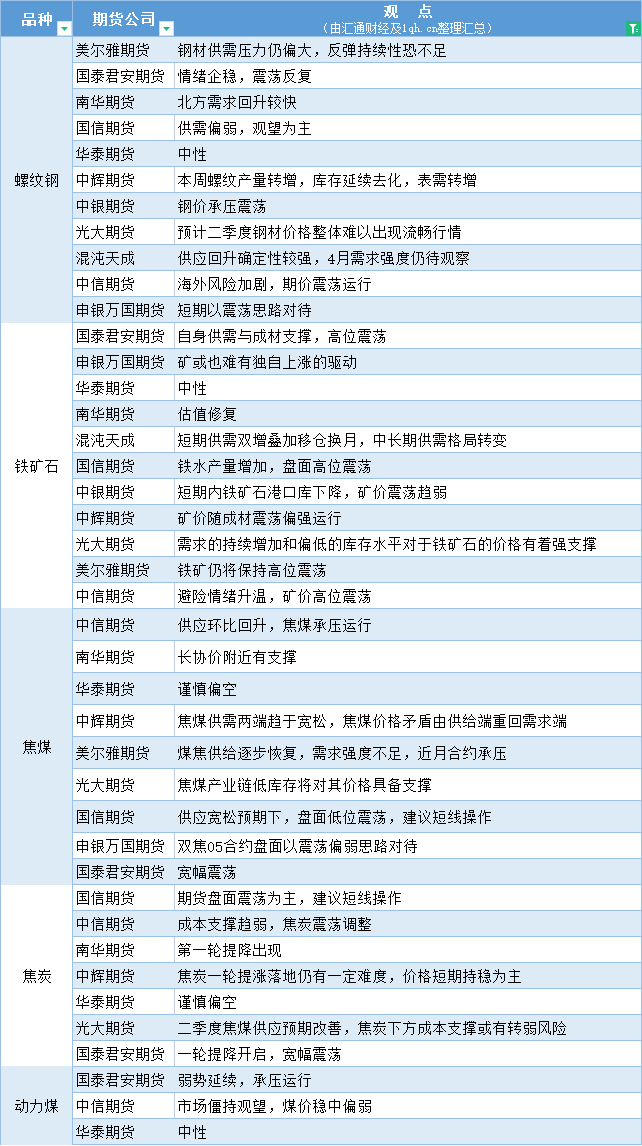 期货公司观点汇总一张图:4月3日黑色系(螺纹钢、焦煤、焦炭、铁矿石、动力煤等)