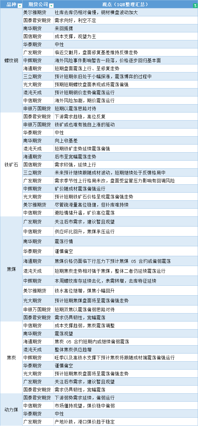 期货公司观点汇总一张图:3月31日黑色系(螺纹钢、焦煤、焦炭、铁矿石、动力煤等)