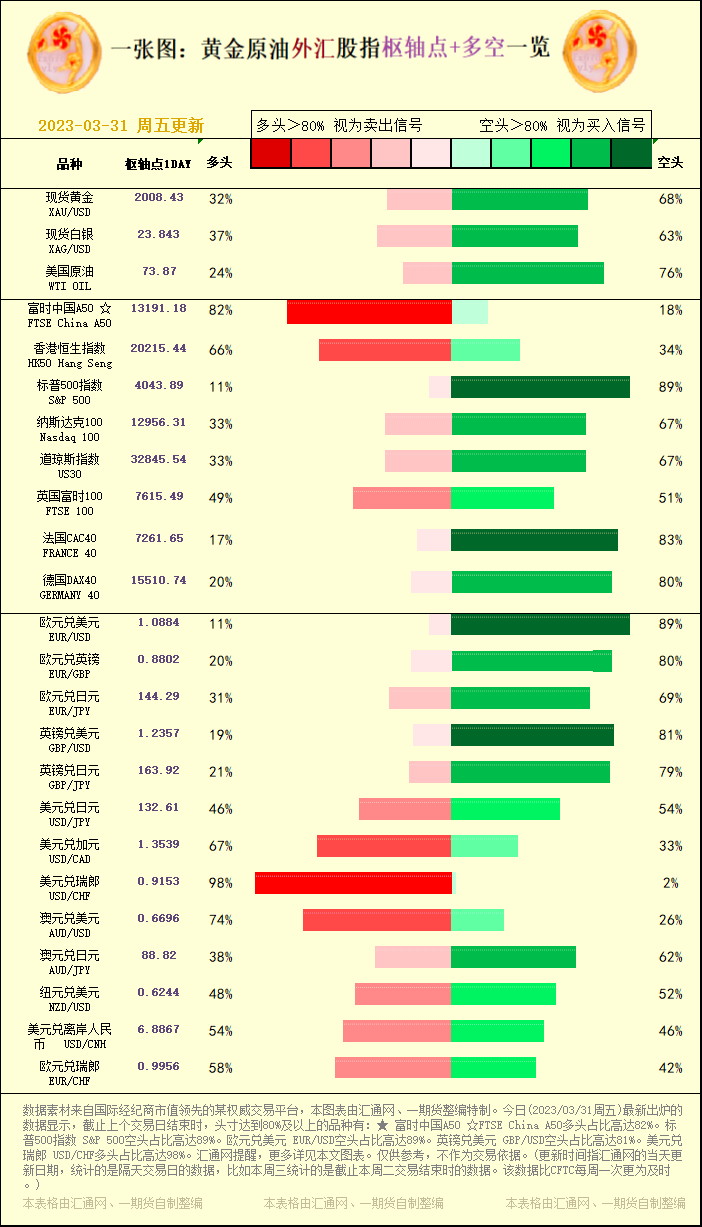 一张图:黄金原油外汇股指"枢纽点+多空占比"一览(2023/03/31周五)