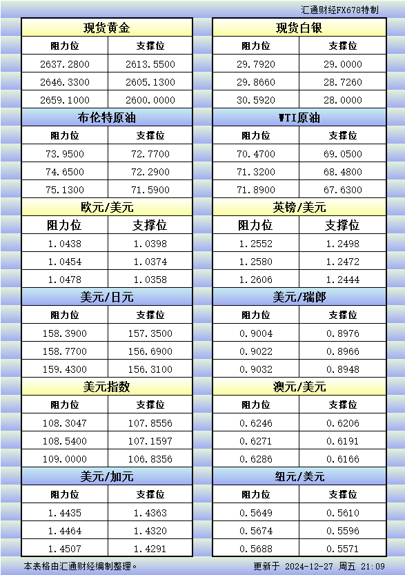 12月27日美市更新的支撑阻力:金银原油+美元指数等八大货币对