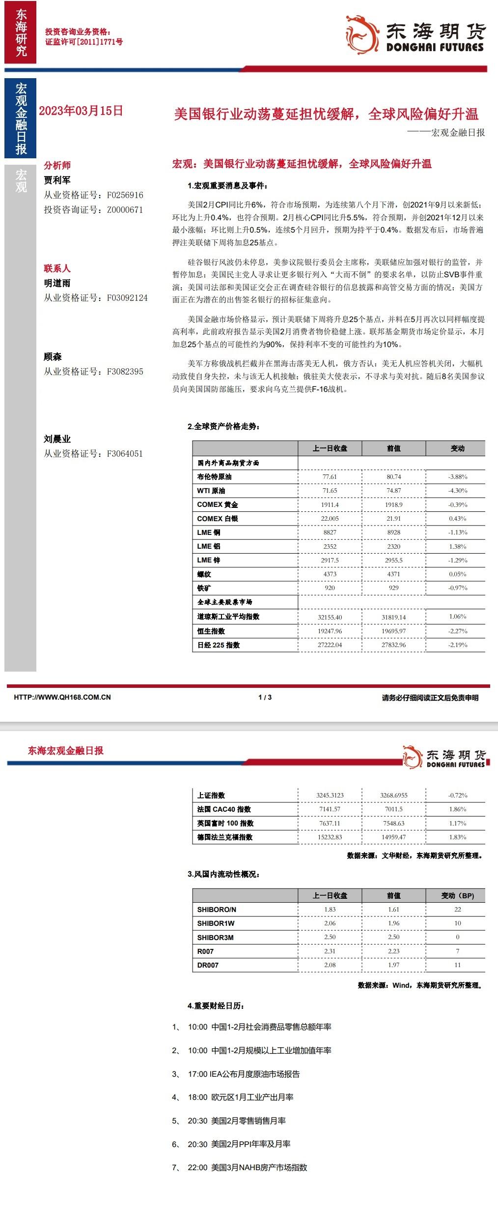 【东海期货3月15日宏观金融日报】:美国银行业动荡蔓延担忧缓解,全球风险偏好升温