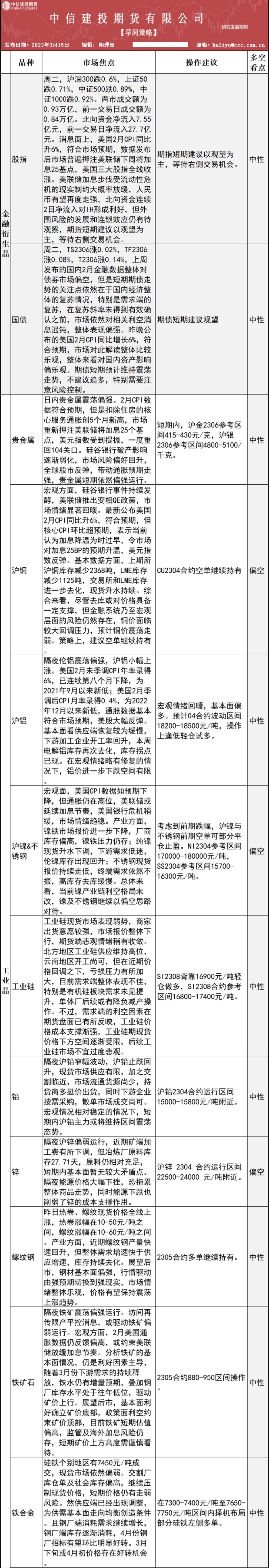 中信建投期货3月15日早间交易策略