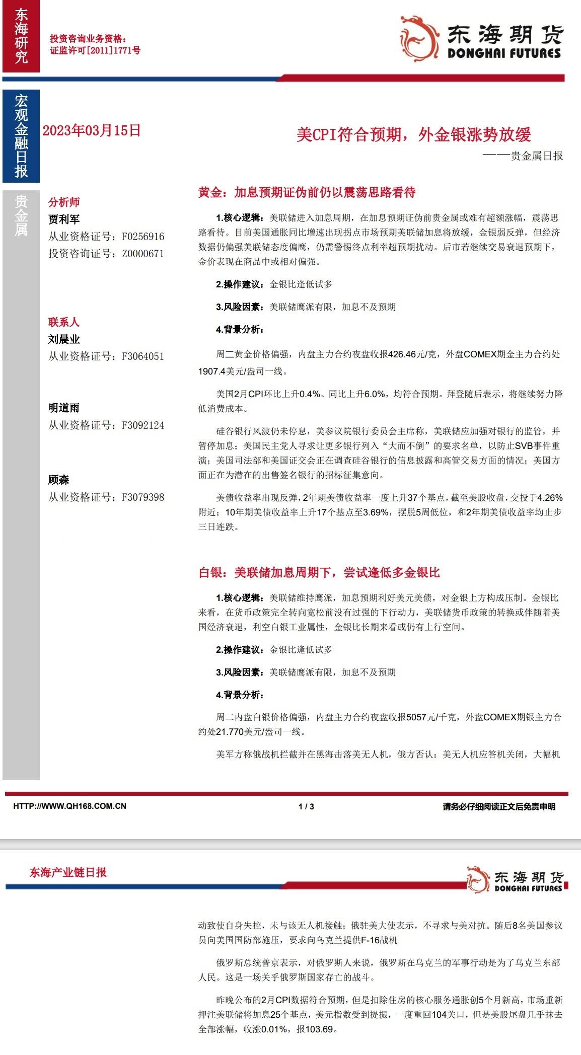 【东海期货3月15日产业链日报】贵金属篇:美CPI符合预期,外金银涨势放缓