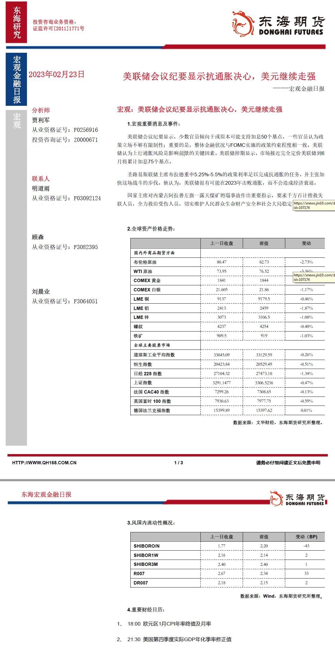 【东海期货2月23日宏观金融日报】美联储会议纪要显示抗通胀决心,美元维持强势