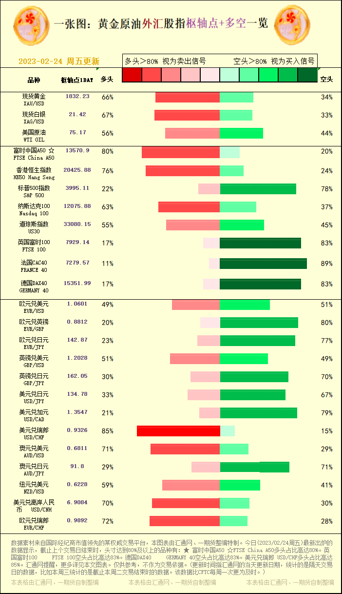 一张图:黄金原油外汇股指"枢纽点+多空占比"一览(2023/02/24周五)
