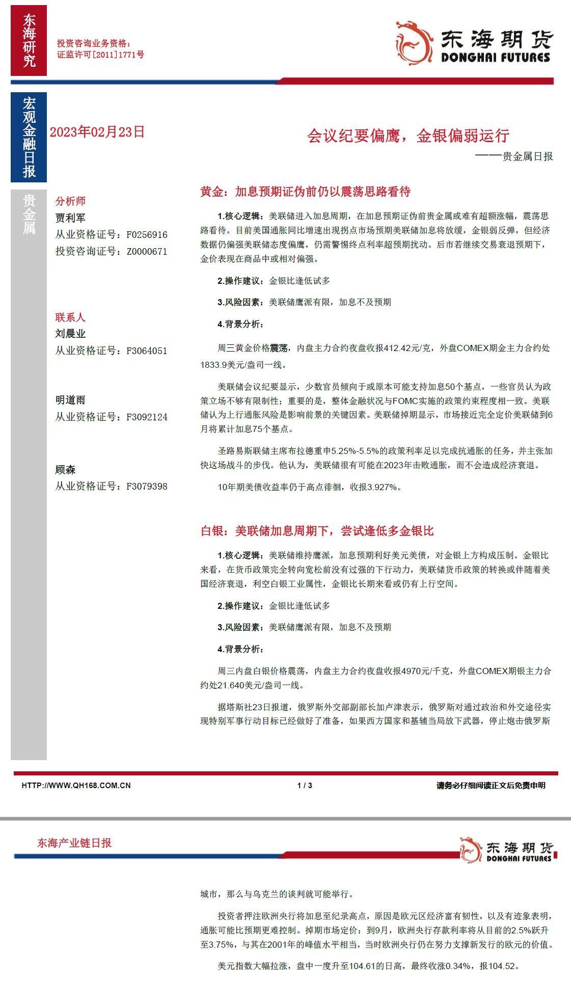 【东海期货2月23日产业链日报】贵金属篇:会议纪要偏鹰,金银偏弱运行