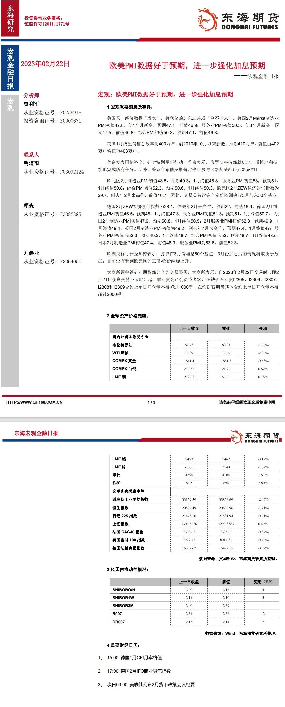【东海期货2月22日宏观金融日报】:欧美PMI数据好于预期,进一步强化加息预期
