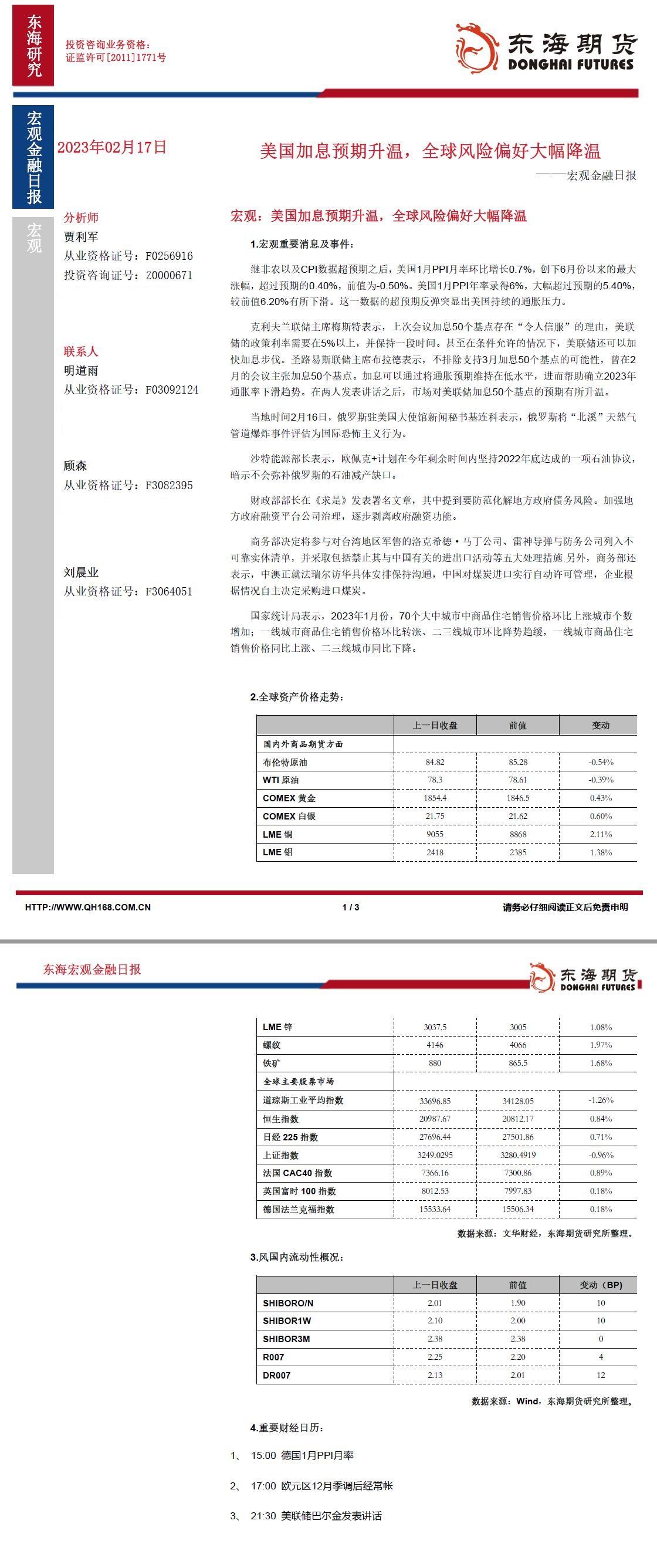 【东海期货2月17日宏观金融日报】美国加息预期升温,全球风险偏好大幅降温