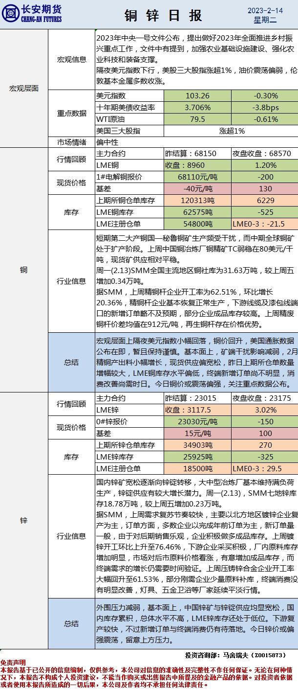 长安期货铜锌早评:今日或震荡偏强
