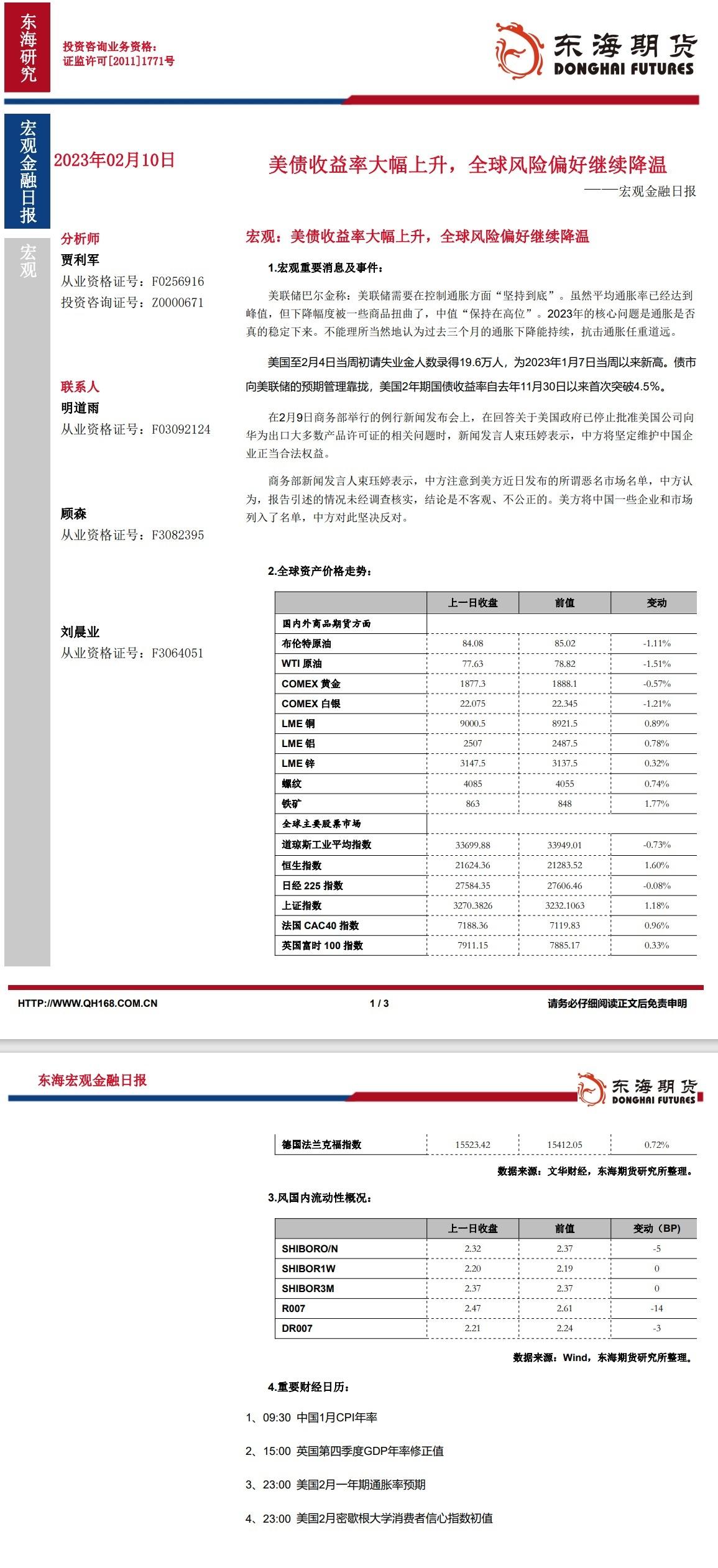 【东海期货2月10日宏观金融日报】:美债收益率大幅上升,全球风险偏好继续降温