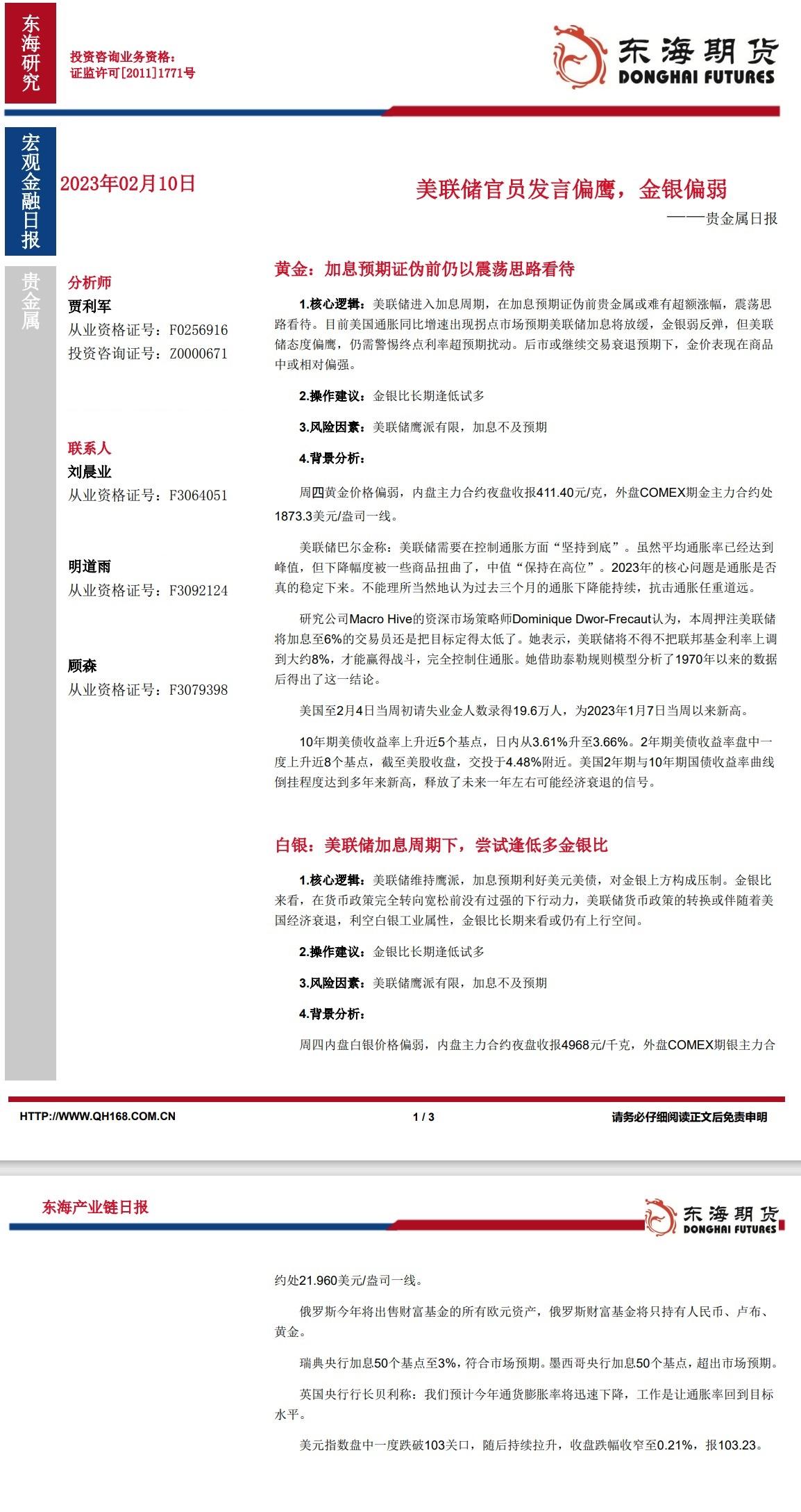 【东海期货2月10日产业链日报】贵金属篇:美联储官员发言偏鹰,金银偏弱