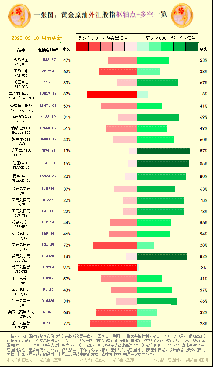 一张图:黄金原油外汇股指"枢纽点+多空占比"一览(2023/02/10周五)