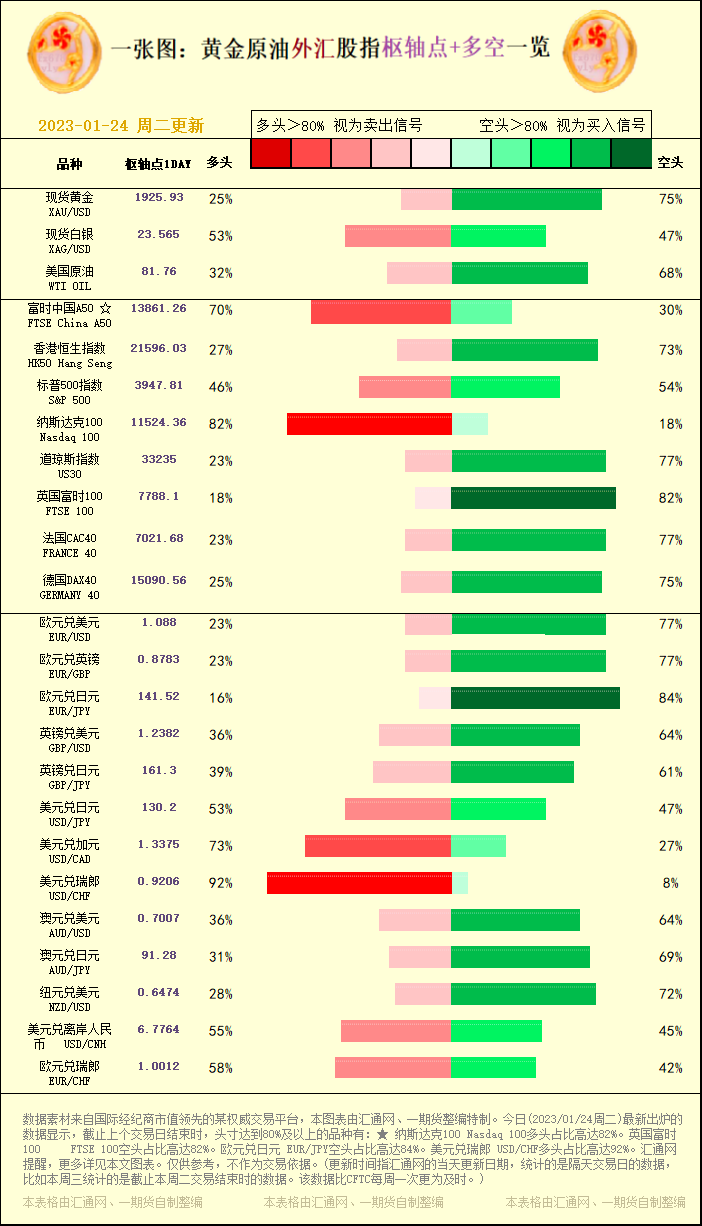 一张图:黄金原油外汇股指"枢纽点+多空占比"一览(2023/01/24周二)
