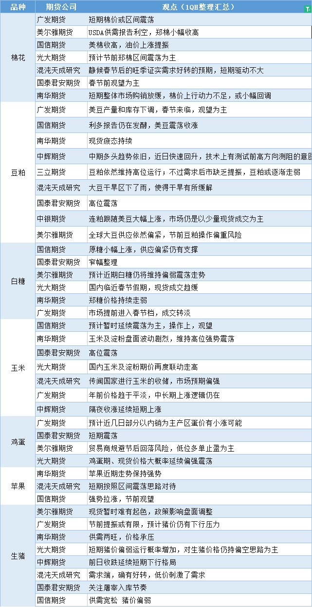 期货公司观点汇总一张图:1月16日农产品(棉花、豆粕、白糖、玉米、鸡蛋、生猪等)