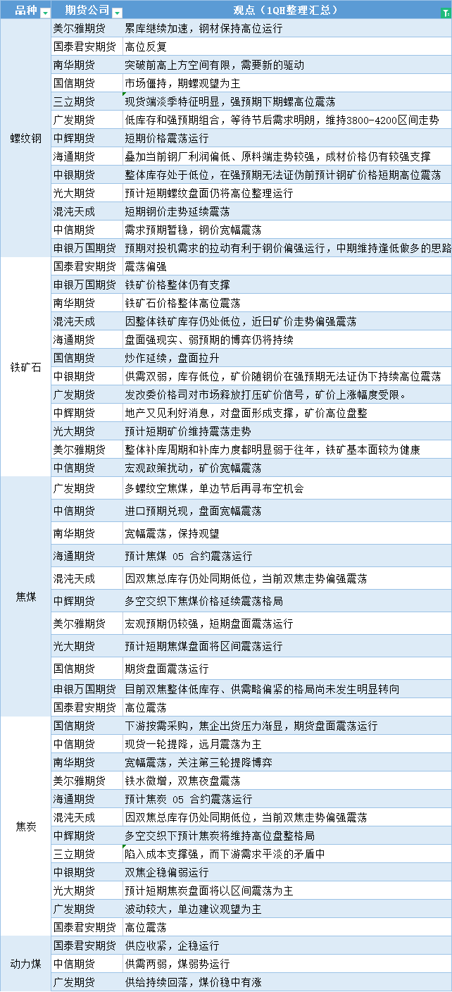 期货公司观点汇总一张图:1月13日黑色系(螺纹钢、焦煤、焦炭、铁矿石、动力煤等)