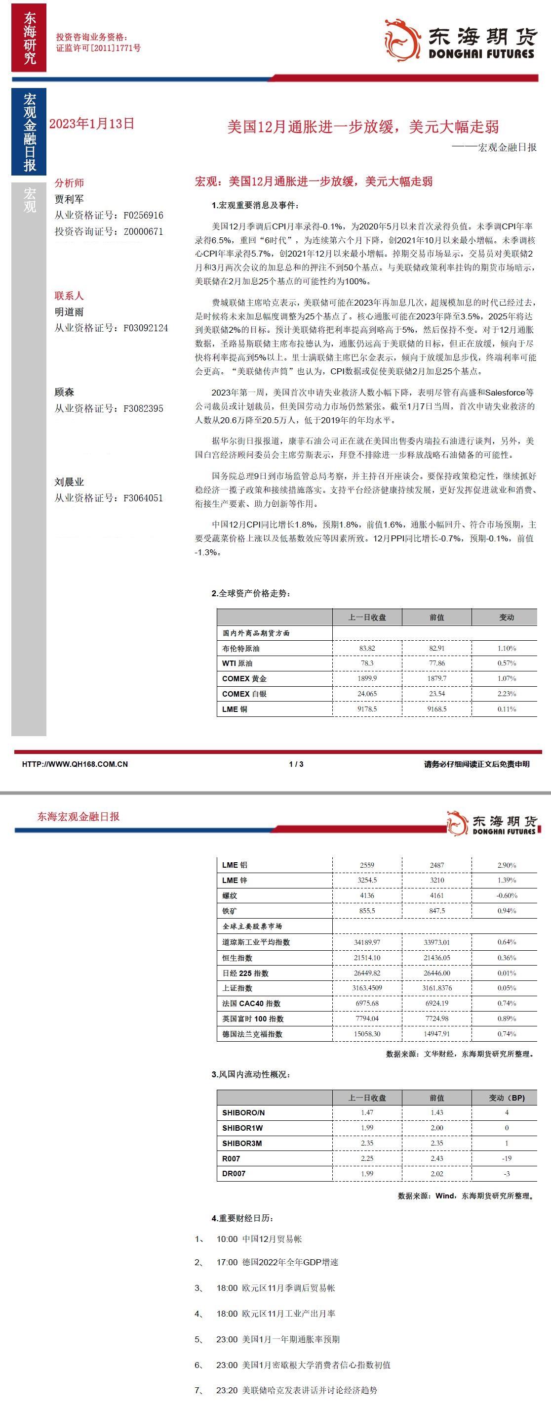 【东海期货1月13日宏观金融日报】美国12月通胀进一步放缓,美元大幅走弱