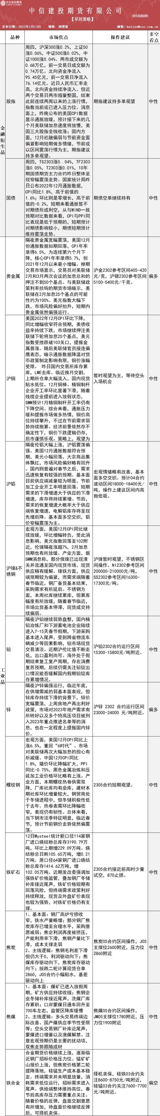 中信建投期货1月13日早间交易策略