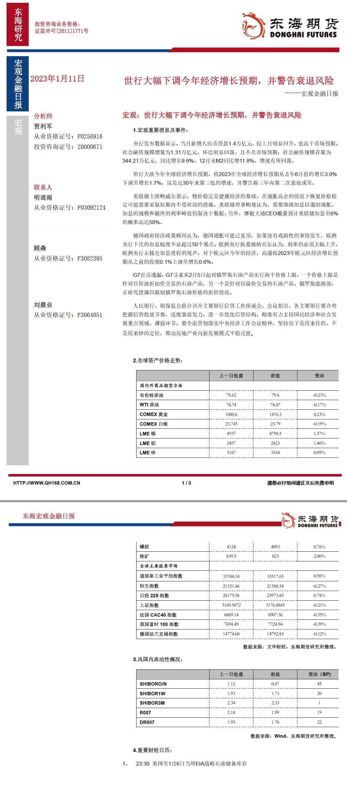 【东海期货1月11日宏观金融日报】世行大幅下调今年经济增长预期,并警告衰退风险
