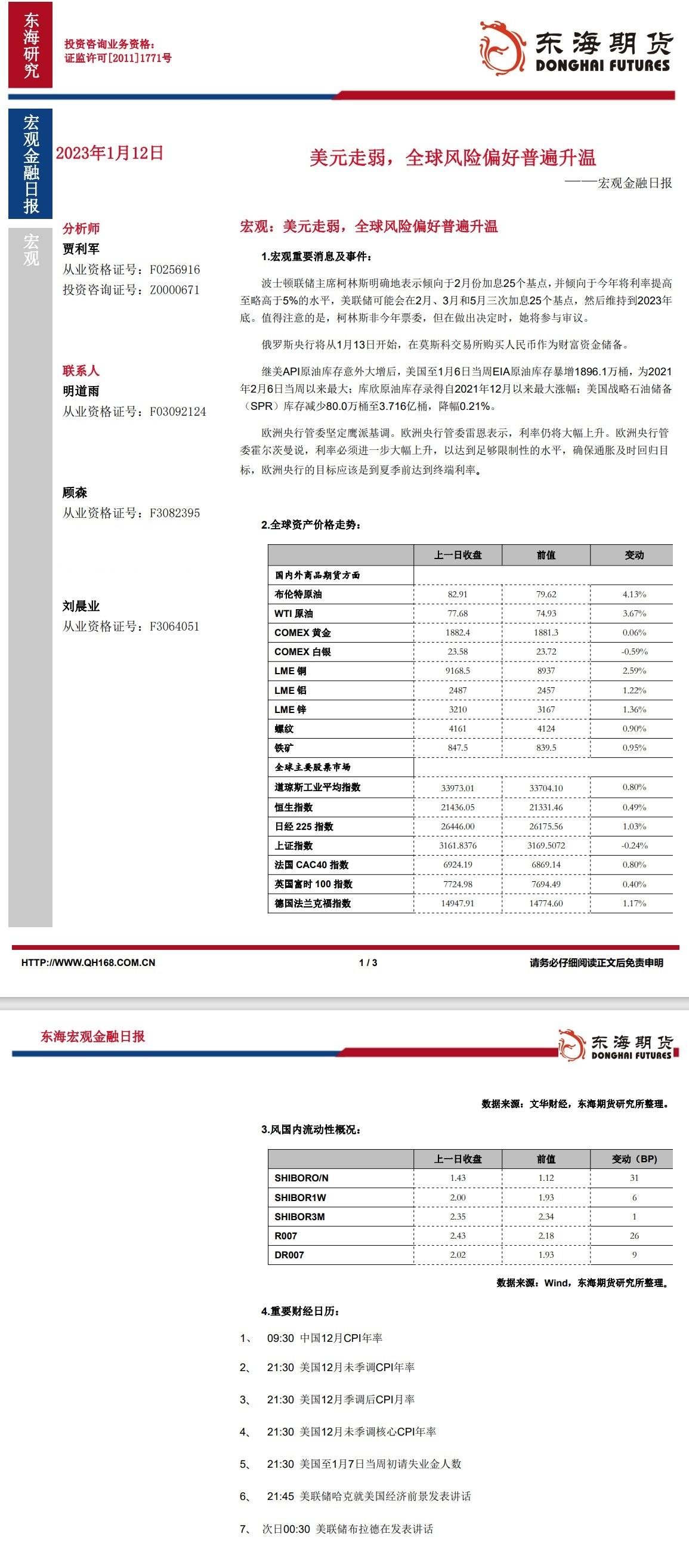 【东海期货1月12日宏观金融日报】:美元走弱,全球风险偏好普遍升温