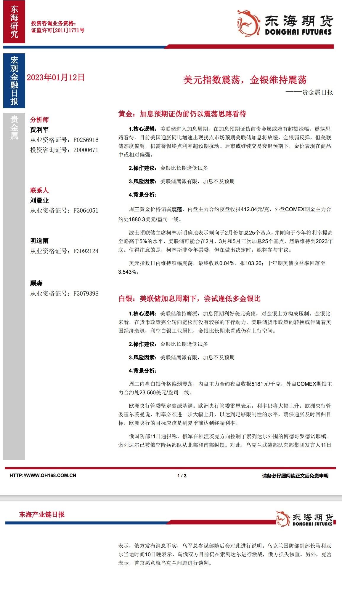【东海期货1月11日产业链日报】贵金属篇:美联储官员发言鹰派,金银震荡