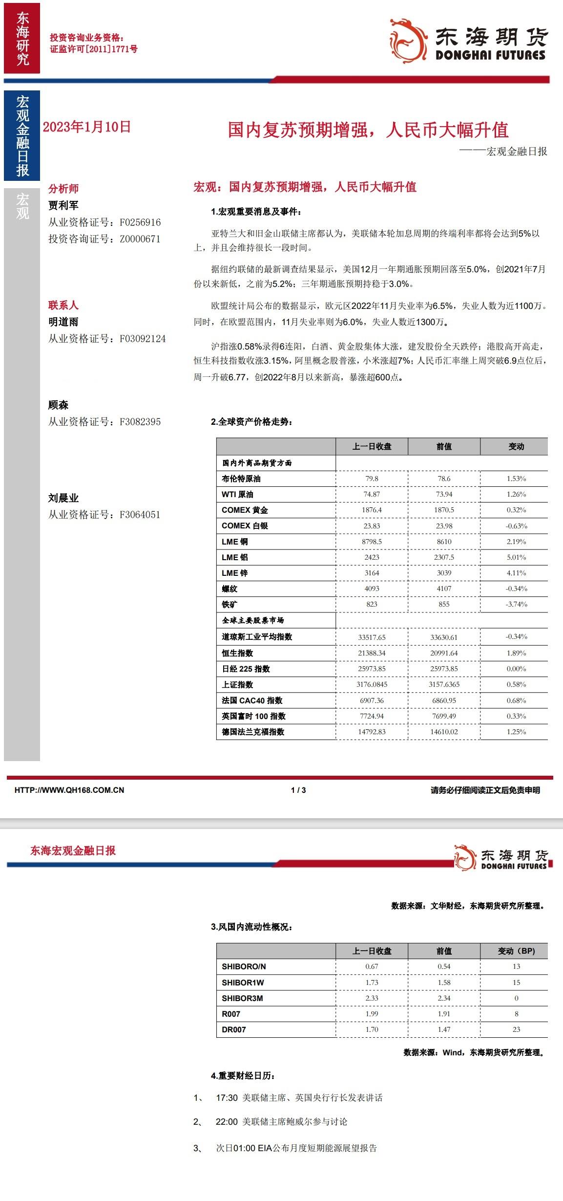 【东海期货1月10日宏观金融日报】:国内复苏预期增强,人民币大幅升值