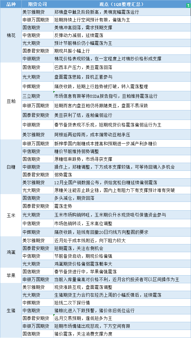 期货公司观点汇总一张图:1月10日农产品(棉花、豆粕、白糖、玉米、鸡蛋、生猪等)