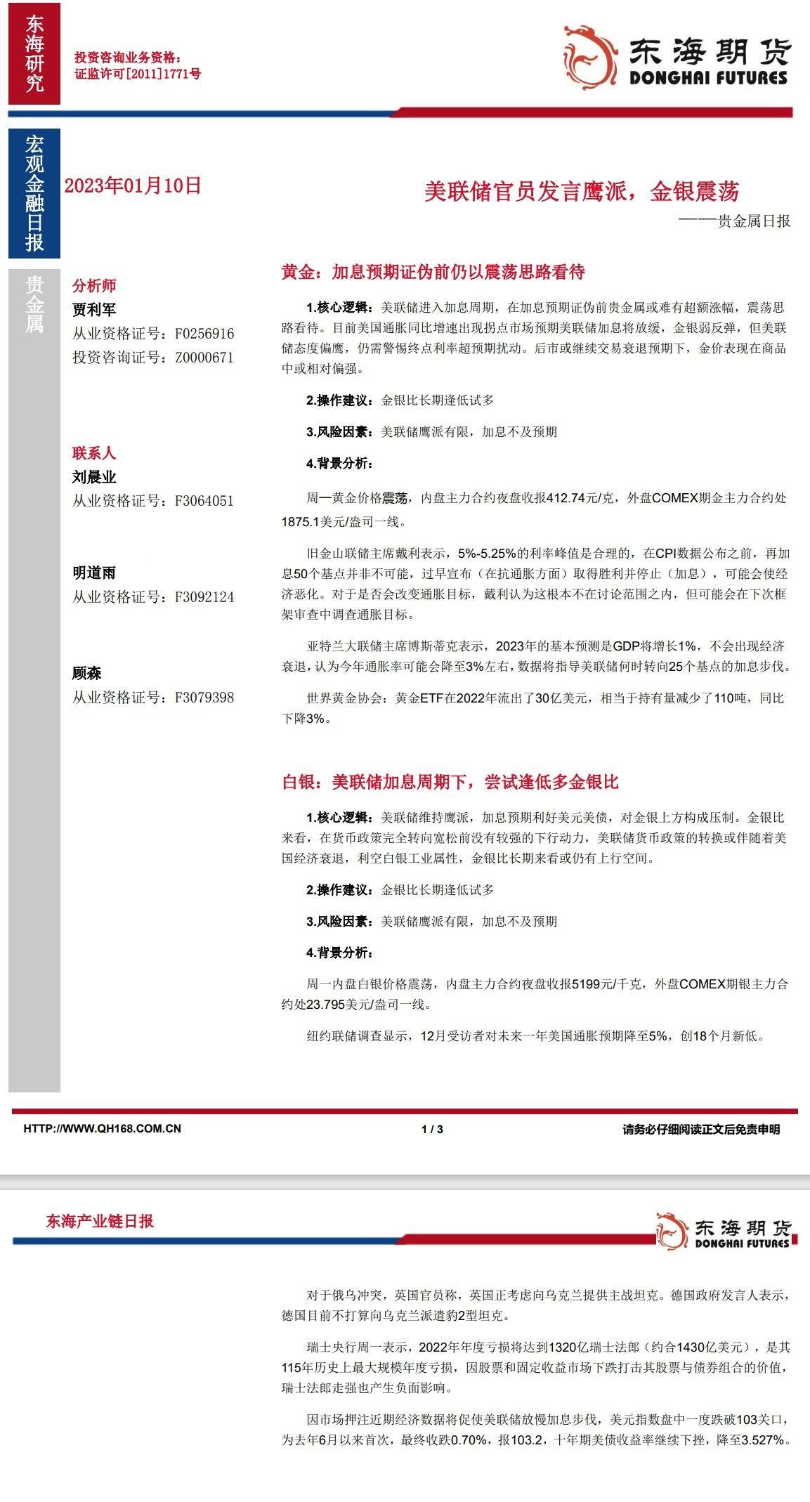 【东海期货1月10日产业链日报】贵金属篇:美联储官员发言鹰派,金银震荡