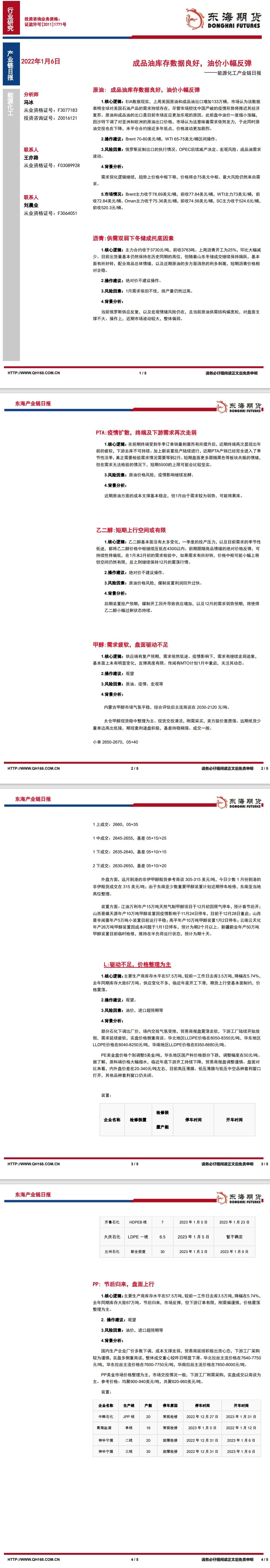 【东海期货1月6日产业链日报】能化篇:成品油库存数据良好,油价小幅反弹
