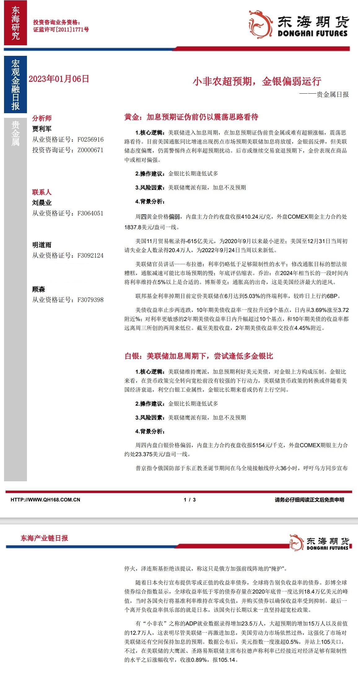 【东海期货1月6日产业链日报】贵金属篇:小非农超预期,金银偏弱运行