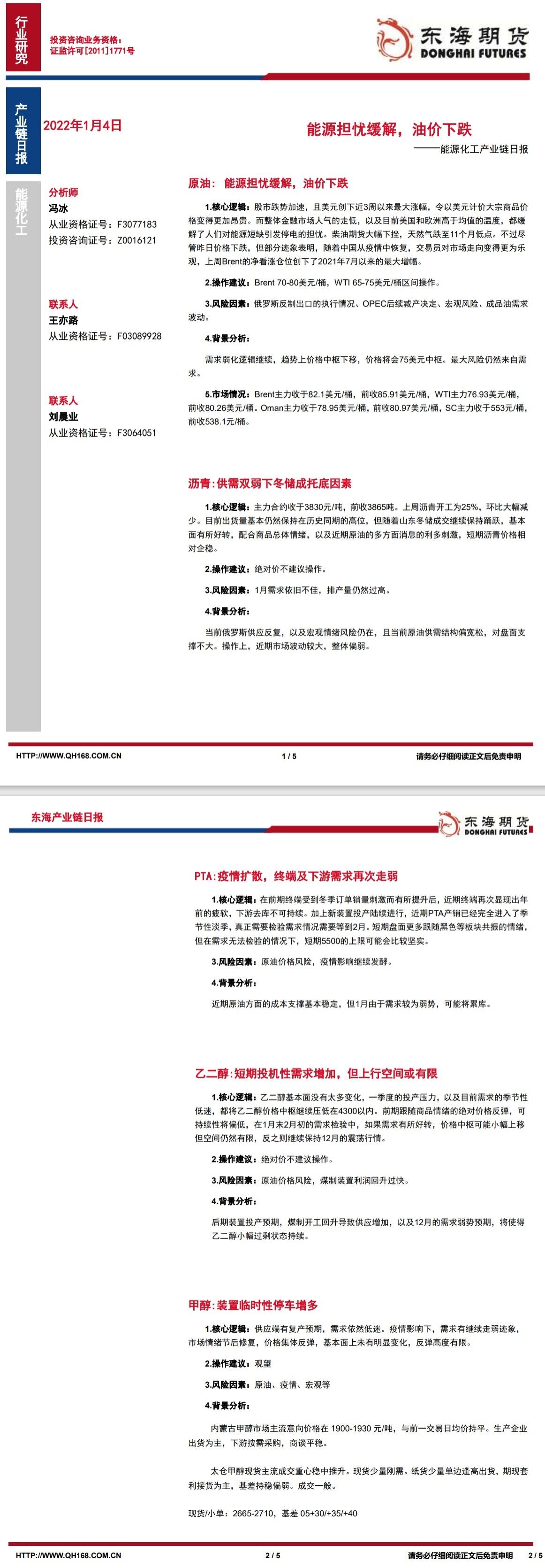 【东海期货1月4日产业链日报】能化篇:能源担忧缓解,油价下跌