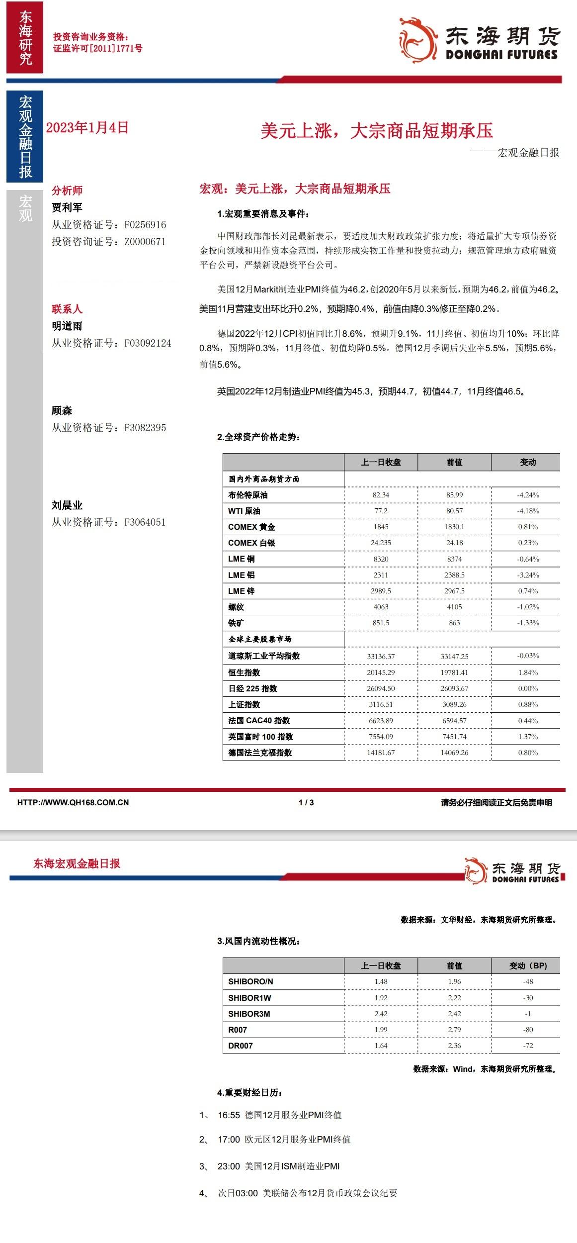 【东海期货1月4日宏观金融日报】:美元上涨,大宗商品短期承压